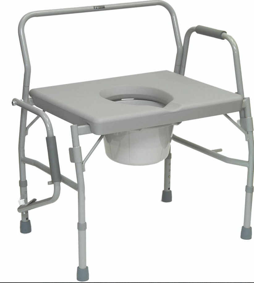 The ProBasics Bariatric Drop-Arm Commode features a durable steel frame with an easy-release push button arm mechanism allowing for safe lateral patient transfers to and from the commode. Equipped with wider seat and reinforced steel frame to support patient weights up to 650 pounds, it comes complete with commode bucket and lid.